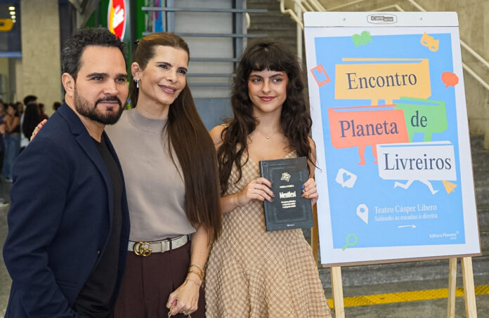 A jovem escritora Isabella Fonseca participou nesta quinta-feira (19), ao lado dos pais Luciano Camargo e Flávia Camargo, do Encontro de Livreiros 2026, realizado pela Editora Planeta no Teatro Cásper Líbero, na Avenida Paulista.